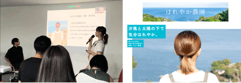 神奈川・相模原市出身で、大学卒業後小田原に移住し、2年間農家で研修を受けた後に2023年にはれやか農園を立ち上げられたという方。レモン、湘南ゴールド等のかんきつ類、キウイフルーツなどを生産し、ECサイトやオンライン、マルシェ等で販売されているとのこと。子どもたちの農業体験にも取り組んでいきたいと話されました。