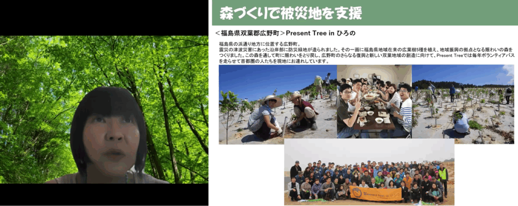 続いて、認定NPO法人 環境リレーションズ研究所の鈴木敦子代表から、「吉田さんのお名前を聞くと今でも涙腺が緩む」としつつ、広野町におけるプレゼントツリーの取組み等についてスライドを用いて紹介してくださいました。