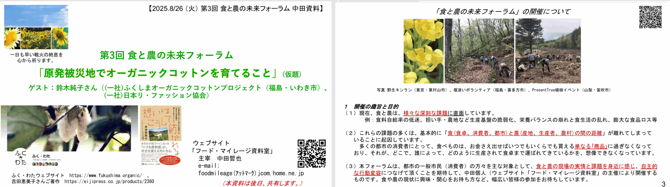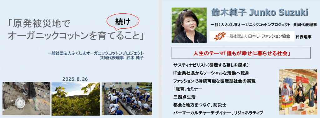 2025年8月26日(火)19時からは、鈴木純子さん(ふくしまオーガニックコットンプロジェクト、福島・いわき市)をゲストにお招きして、第3回をオンライン開催しました。