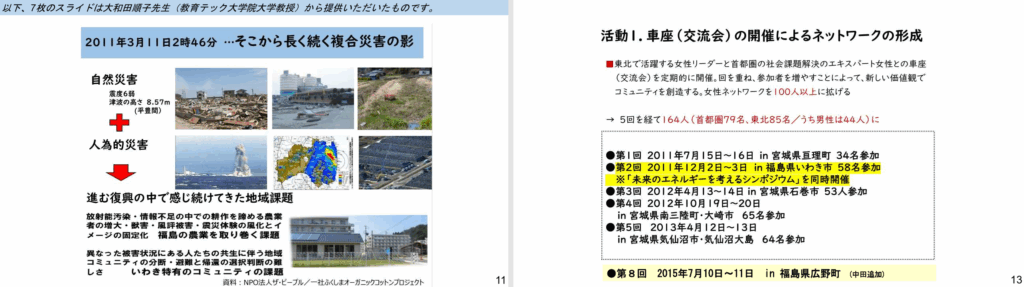 ふくしまオーガニックコットンプロジェクトの発足の経緯等については、大和田順子先生に提供いただいたスライドを使って説明させて頂きました。