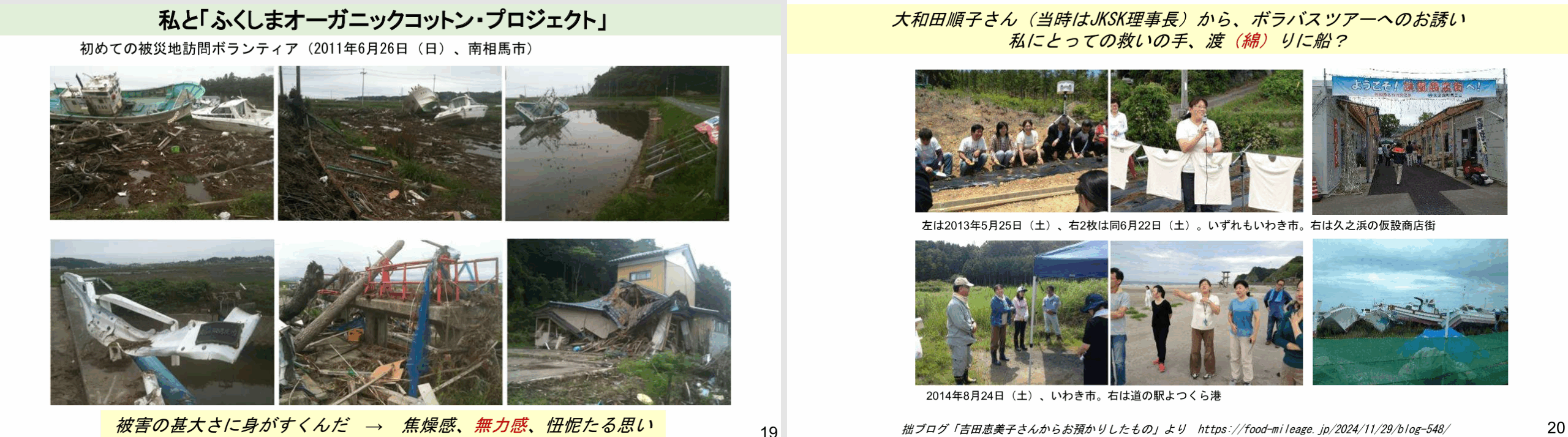 さらに、私個人のふくしまオーガニックコットンプロジェクトとの関わりについて、故 吉田恵美子さんとの交流の思い出も含めて紹介させて頂きました。