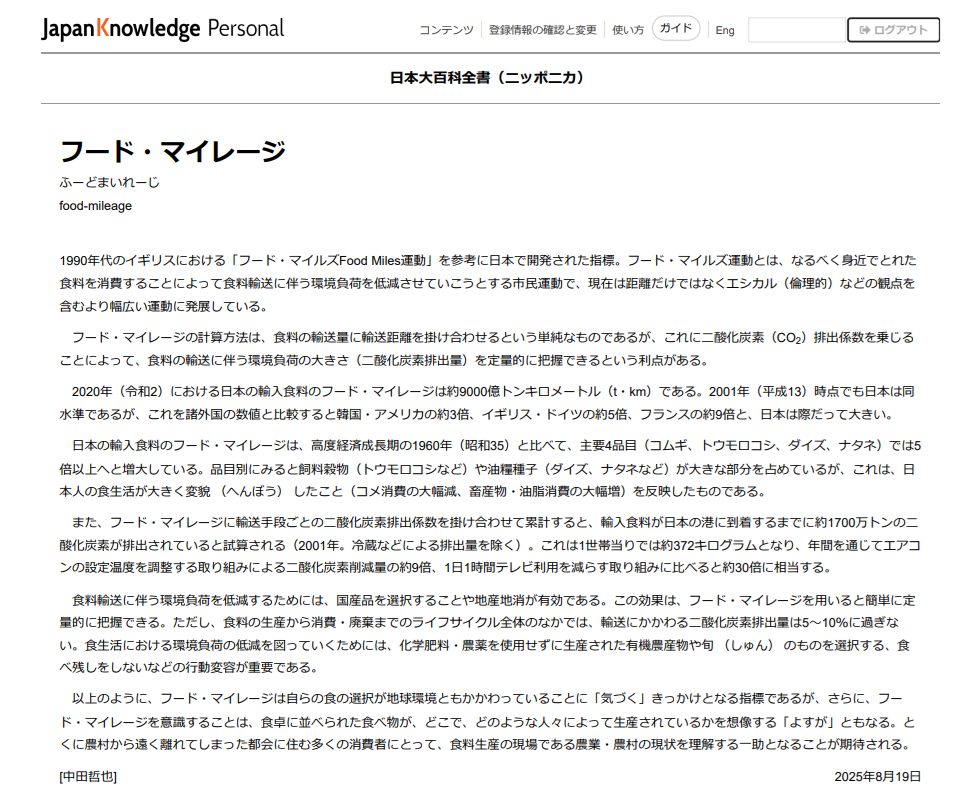 (株)小学館から依頼を受け、『日本大百科全書(ニッポニカ)』の「フード・マイレージ」の項目について寄稿させて頂きました。