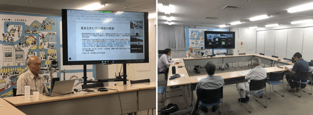 18時30分から会議室で開催されたのは、農あるまちづくり講座のフォローアップ講座。会場とオンラインで合計約30名が参加し、蔦谷栄一先生(農的社会デザイン研究所)から「農あるまちづくり講座のフォローアップ講座のねらいと、その目指す方向」と題する講義がありました。