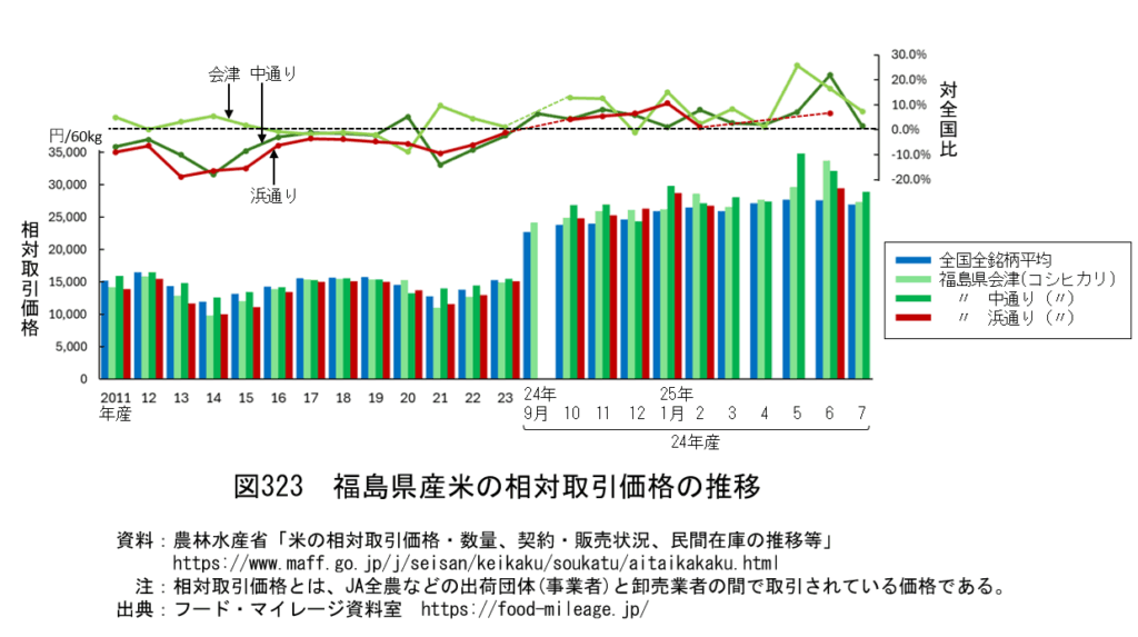 リンク先の図323は、米の全国平均価格と、福島県の地域別の米の価格の推移を示したものです。