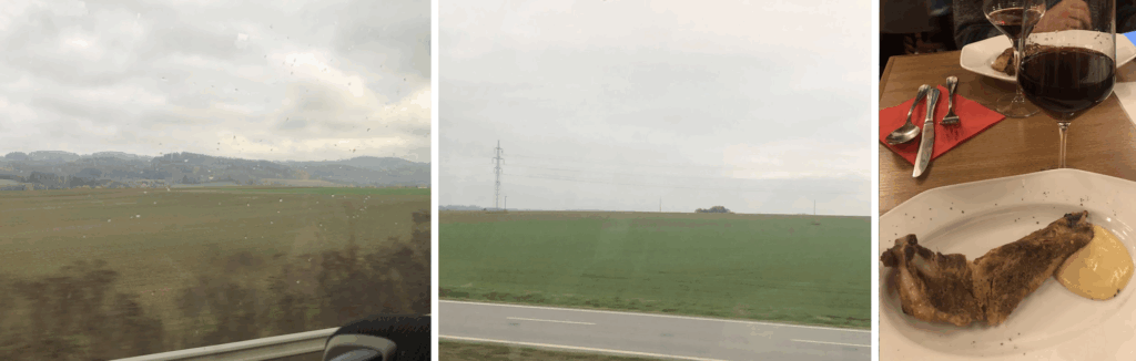9時45分ウィーン発のオーストリア航空(OS315)。窓からはアルプスの山並み、広々としたスイスの農村風景。