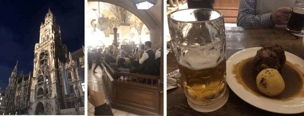高い天井の絵画、バンド演奏。勝手にテーブルに着いて(フィンランドからのご夫妻と相席に)、店員さんを呼び止めて1リットルジョッキのビール(やや淡白で大味)。食事はソーセージの盛り合わせ、豚すね肉の丸焼(Schweinshaxe)、プレッツェルなど。すごいボリューム、後から来た同じツアーの若い女性に手伝ってもらいました。
