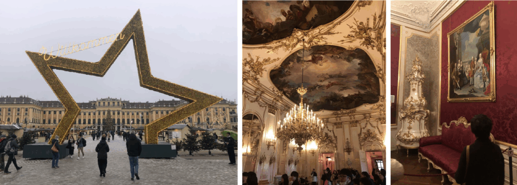 入り口にはクリスマスの飾り付けがなされ、宮殿前の広場では多くの露店が開店準備中。その奥に、テレジアンイエローの宮殿の建物が見えます。17世紀末に着工され、第一次世界大戦後までハプスブルク家の離宮として使われていたそうです。