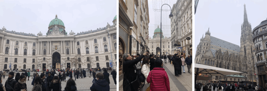 歩行者天国となっているコールマルクト通りからクラーベン通りへ。高級ブランド店や土産もの屋さんが軒を連ねています。巨大なペスト終焉の記念柱なども。ここにも世界中からの観光客。