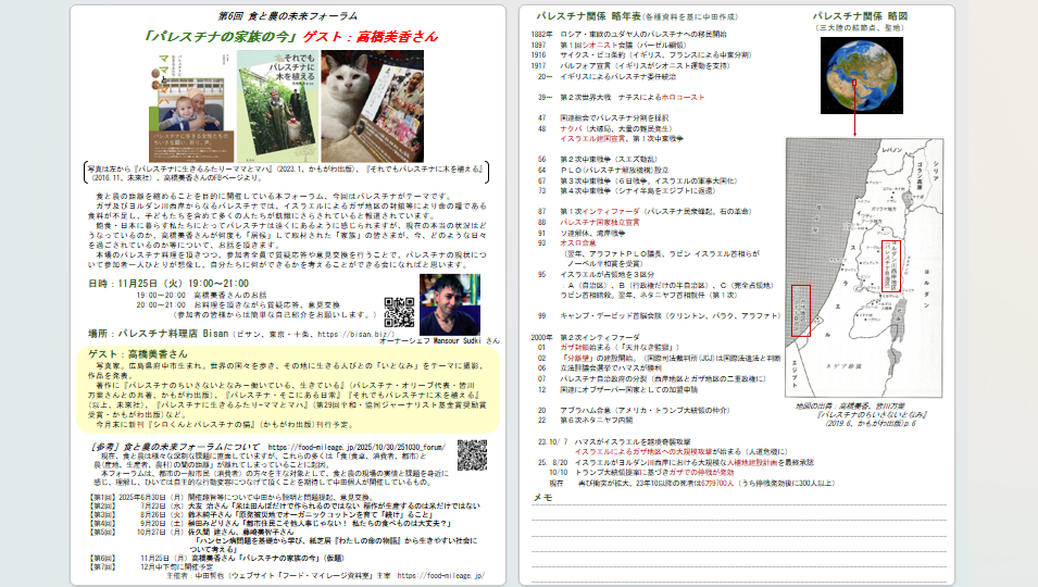 飽食・日本に暮らす私たちにとってパレスチナ問題は遠いところにあるように感じられますが、美香さんが何度も「居候」して取材された「家族」の皆さまが、今、どのような日々を過ごされているのか等についてお話を頂き、本場のパレスチナ料理を頂きつながら質疑応答・意見交換等を行うことで、自分たちに何ができるかを考えようという趣旨です。