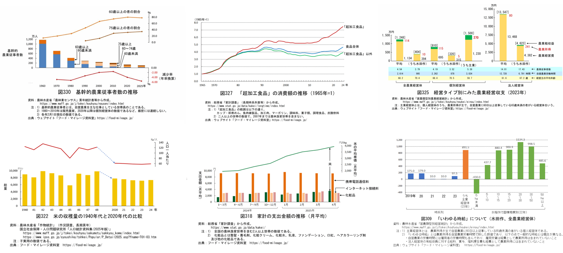 それでも小規模層では赤字で[No.319]、全体としても経営収支は厳しい状況にあること[No.325]。就業者一人当たり純生産をみても第一次産業は他産業に比べて4分の1程度の低い水準で推移していること[No.310]のデータを紹介。