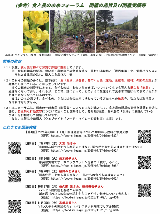 本フォーラムは、都市の一般市民(消費者)の方々を主な対象として、食と農の現場の実情と課題を身近に感じ、理解し、ひいては自主的な行動変容につなげて頂くことを期待して、個人(ウェブサイト「フード・マイレージ資料室」)の主催により開催するものです。