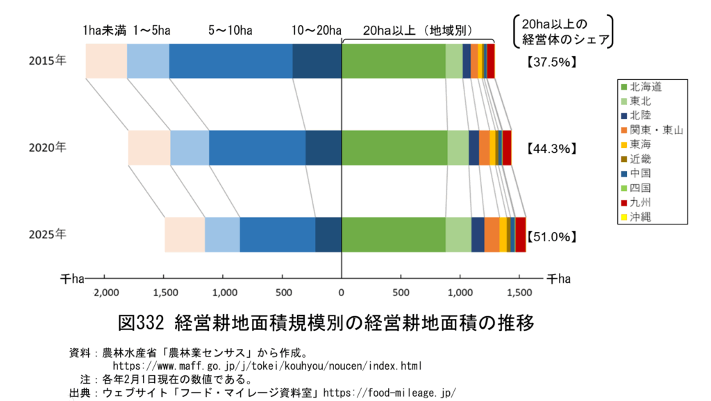 昨年11月に農林水産省が公表した資料「2025年農林業センサス結果の概要(概数値)」には、「経営耕地面積20ha以上の農業経営体の面積シェアが初めて5割を超えるなど、規模拡大が進展」とあります。