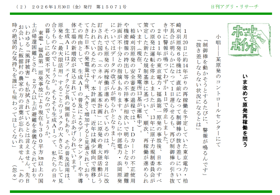 2026年1月30日付の『日刊アグリ・リサーチ』(農業情報調査会発行)にコラムを掲載して頂きました。