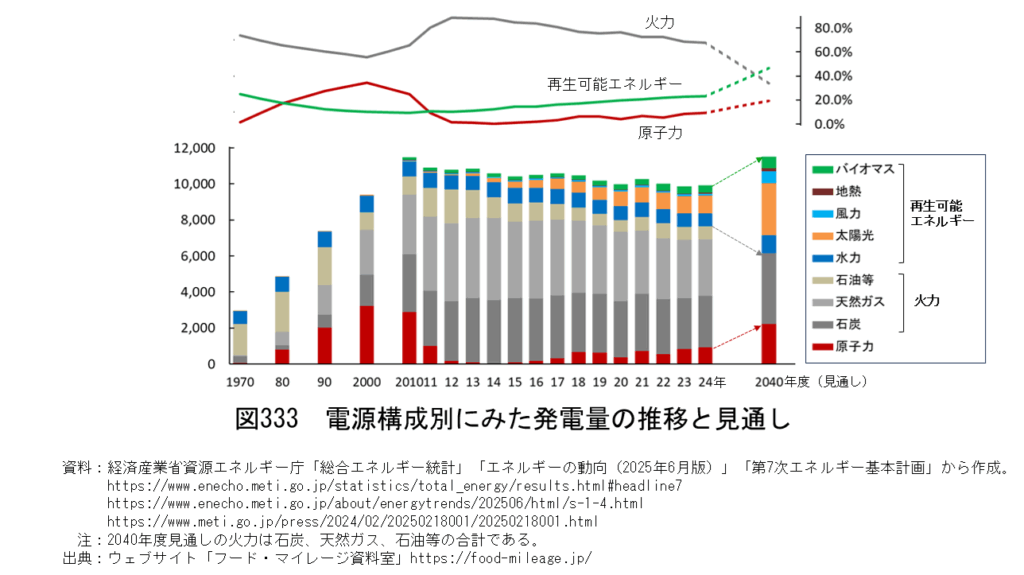 リンク先の図333は、日本の発電量の長期的推移と見通しを電源構成別にみたものです。
