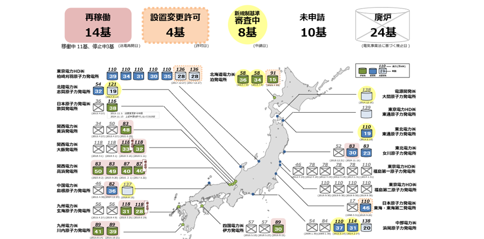 2011年の東京電力・福島第一原発の事故後、日本のすべての原発は運転を停止しました。その後、2013年に原子力規制委員会が策定した新たな規制基準に基づいて安全対策が強化され、この基準に合致していると認められた原発については、順次、再稼働が進められています。