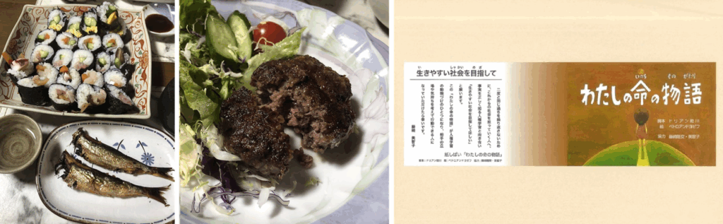 5日(木)の夜は、井さん親子(熊本・産山村)のあか牛のハンバーグを頂きました。ドキュメンタリ『村で生きる』のクラファンの返礼として届けて頂いていたもの。歯応えがあってジューシーでした。