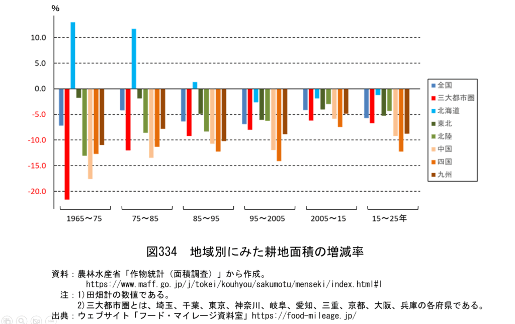 日本の農地面積は1965年の600万4千haから2025年には423万9千haへと、△29.4%と大きく減少しています。リンク先の図334は、日本の農地面積の10年ごとの減少率を地域別にみたものです。