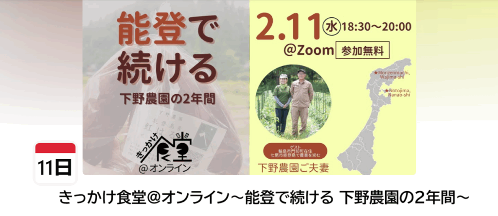 11日(水)は、「きっかけ食堂@オンライン~能登で続ける 下野農園の2年間~」に参加しました。