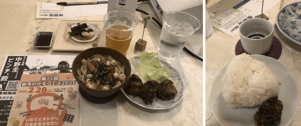 すっぷく(椎茸たっぷりの餡あんかけうどんのような大槌町の郷土料理)、南部せんべいを衣に使ったから揚げ、大船渡産のホタテの刺身など。最後には塩むすび(野田村、花巻市)も頂きました。