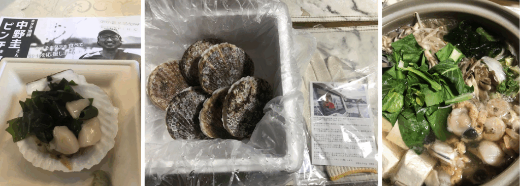「支援」ということではなく、美味しかったので注文させて頂いていたのが、18日(水)、ワカメとともに届きました。ホタテの殻を開ける道具と軍手まで同封されています。