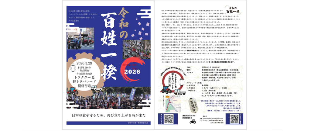 3月29日(日)14時30分から、東京・青山公園をスタート地点に「令和の百姓一揆2026」が挙行されます。都市部の消費者を含む多くの方の参加を期待します。