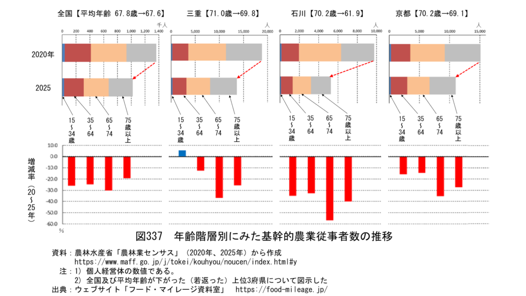 確かに農家(基幹的農業従事者)の平均年齢は2020年の67.8歳から2025年には67.6歳へと0.2歳低下しています。さらにやや詳細に、年齢階層別の基幹的農業従事者数の推移を示したものがリンク先の図337です。