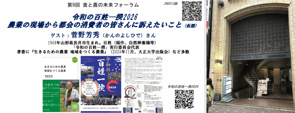 2年目になる「令和の百姓一揆2026」の前日に当たる2026年3月28日(土)18時30分から、「一揆」実行委員会代表の菅野芳秀さんをお迎えして、第9回 食と農の未来フォーラムを開催しました。