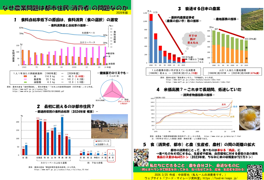 食料自給率の低下は私たちの食の選択の結果であること、大都市圏の自給率は著しく低いこと、農業の生産基盤(担い手、農地)は急速に脆弱化していること、米価は長期間低迷していたこと等について説明しました。