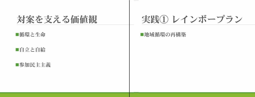 「現在、どんな国・社会を作っていくかについての国民的議論が、かつてなく求められている。自立する道を探るためには、まず、食べものをどうするかから。アメリカ等からの輸入に依存しているような状況とおさらばできるような地域を、足元から作っていかなければならない。誰かがやってくれるだろうではダメだ」