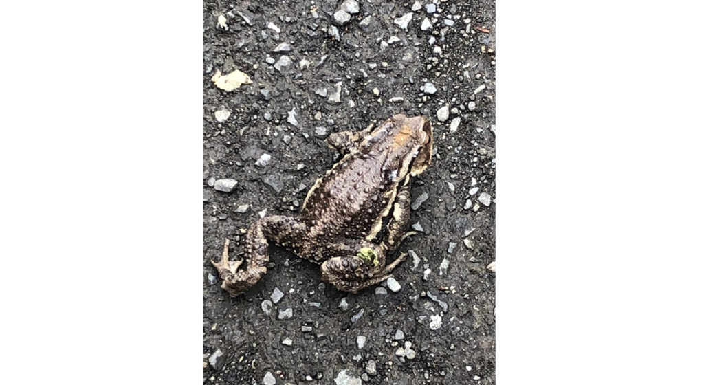 白昼、近所の路上に体長20cmほどのカエル(frog)。啓蟄ですね。